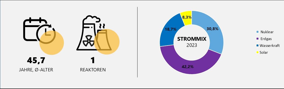• Die Laufzeit wurde bis 2036 verlängert; der Reaktor soll erst abgeschaltet werden, wenn ein Ersatz vorhanden ist.