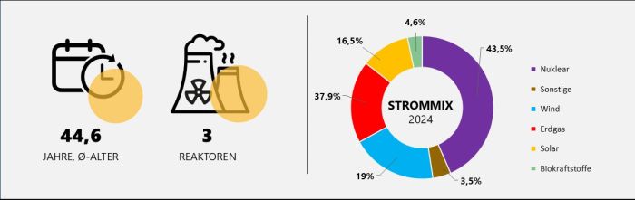 Bis einschließlich 2024 lag der Anteil der Kernenergie an der gesamten Stromerzeugung bei über 43 %. Fossile Energieträger kamen auf etwa 38 % Viertel der knapp 75,7 82 Terawattstunden (TWh), die im Jahr 2024 in Belgien erzeugt wurden. Das Land ist traditionell auf Stromimporte angewiesen. Bei einer rückläufigen Stromproduktion importierte Belgien auch 2024 knapp 14 % des insgesamt verbrauchten Stroms.