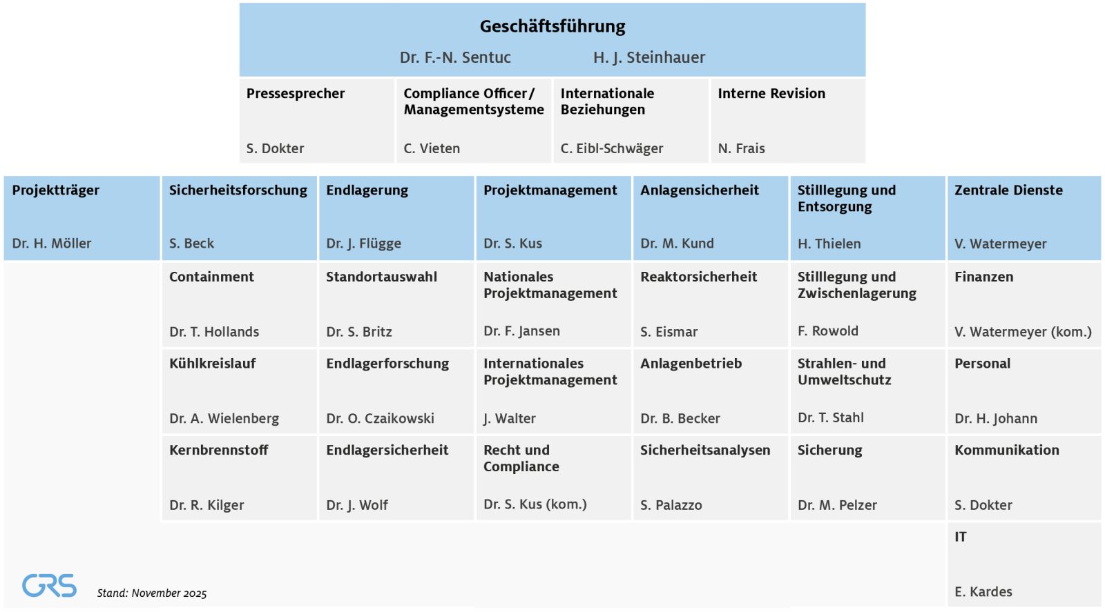 Die Gesellschaft für Anlagen- und Reaktorsicherheit (GRS) gGmbH gliedert sich in sieben Bereiche.
